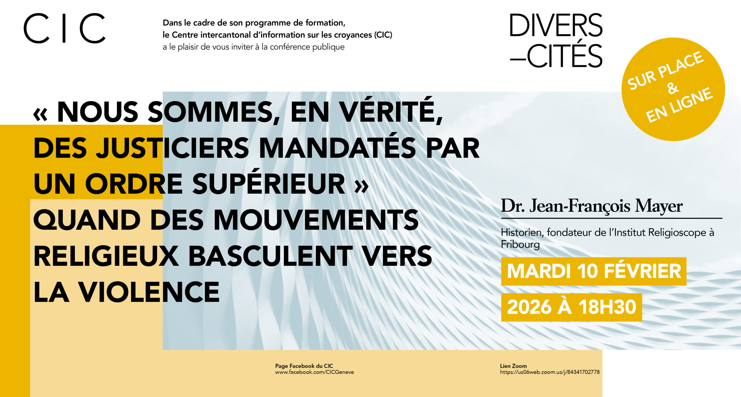 Le CIC vous invite à la conférence publique « « Nous sommes, en vérité, des justiciers mandatés par un ordre supérieur » Quand des mouvements religieux basculent vers la violence » qui se tiendra dans le cadre du module 6 de la formation « Divers-Cités 2025-26 » intitulé « Dérives sectaires, violence et radicalités religieuses ».