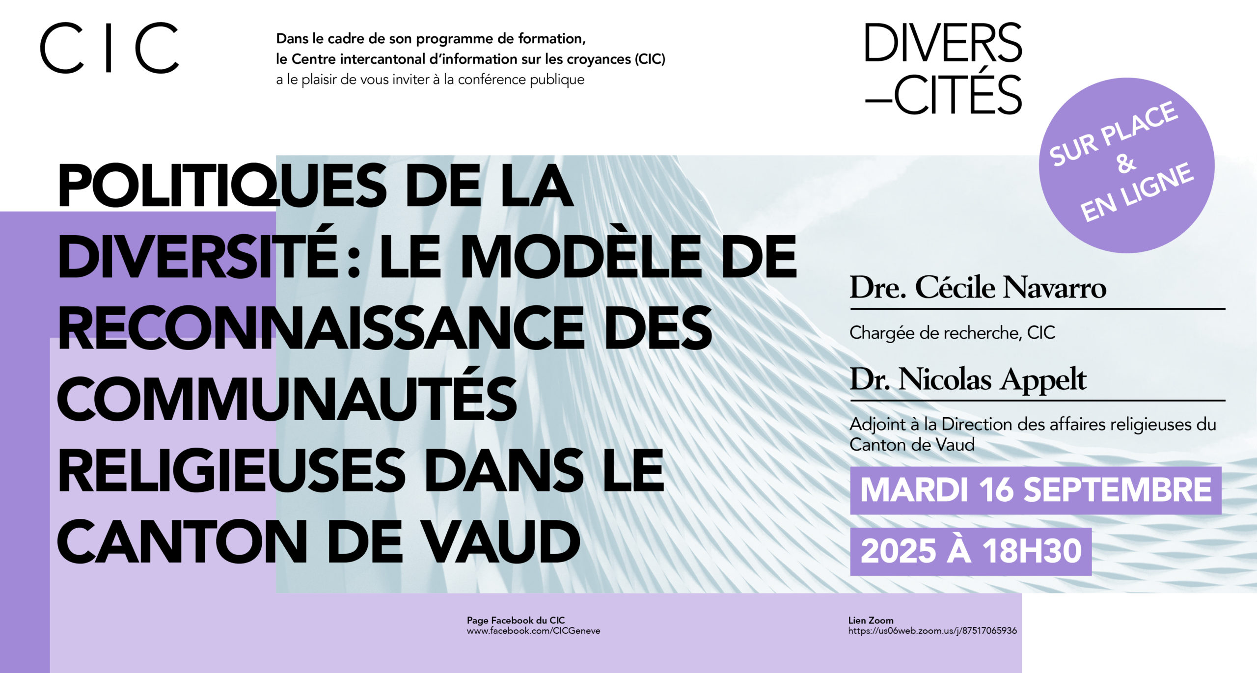 À l’occasion du cycle d’activités lié aux 20 ans du Centre intercantonal d’information sur les croyances (CIC) ainsi que pour le commencement du sixième module de la formation « Divers-Cités 2022-2023 », intitulé « Religion et migration », nous avons le grand plaisir de vous proposer la conférence suivante :